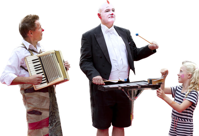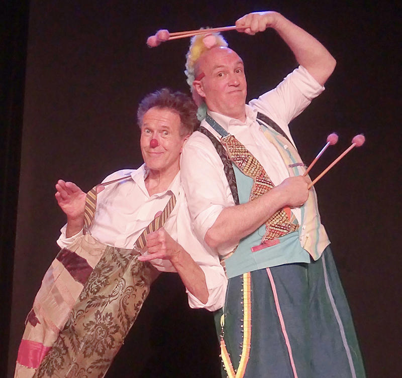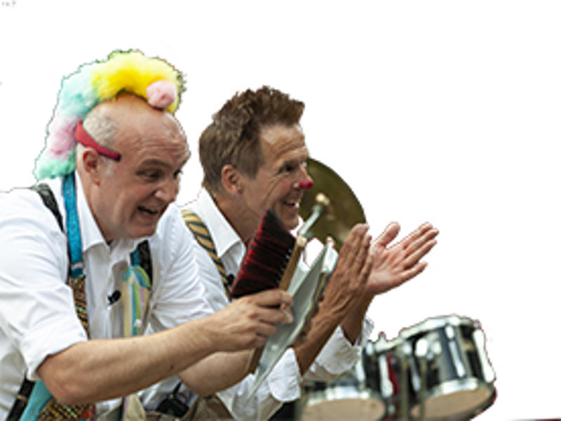 Een man met een 'kleurig plukje haar' speelt percussie of zijn leven ervan afhangt. Zijn clownsmaatje geeft er een heel eigen invulling aan met een muzikale vuilnisbak, een levende bezem, in gevecht met een levensgrote trom, maar ook met een feeërieke zeepbellenact.
