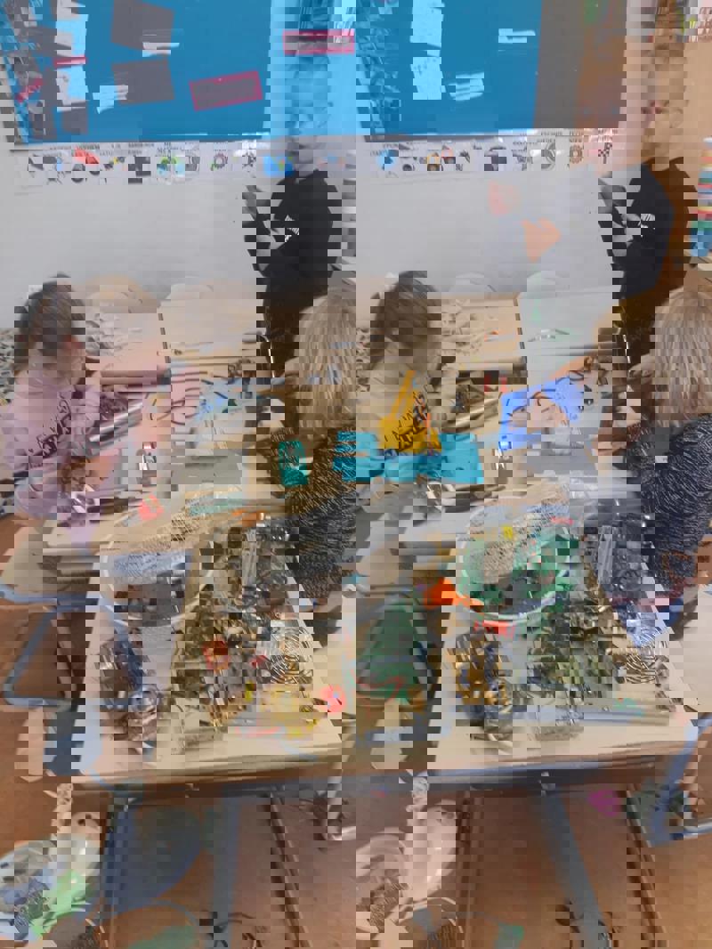 De volgende stap is een kunstzinnige stap: wat zou je van al deze onderdelen kunnen maken? Afhankelijk van jullie wens sluit ik aan op een thema of laat de kinderen juist vrij associeren.